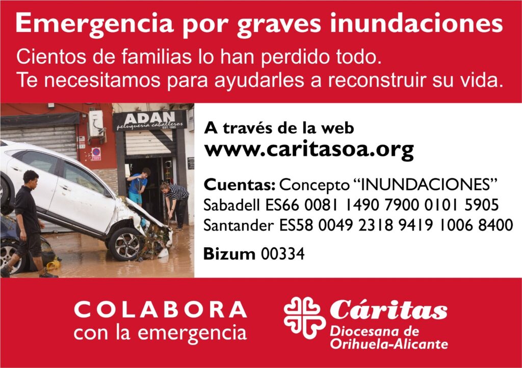 1. A lo largo de la semana que cada alumn@ del colegio pueda aportar 1 € (si alguien quiere más puede hacerlo) y entregarlo a su tutor/a. Todo lo recogido se enviará a la campaña de emergencia de Cáritas en favor de las personas damnificadas por la DANA.