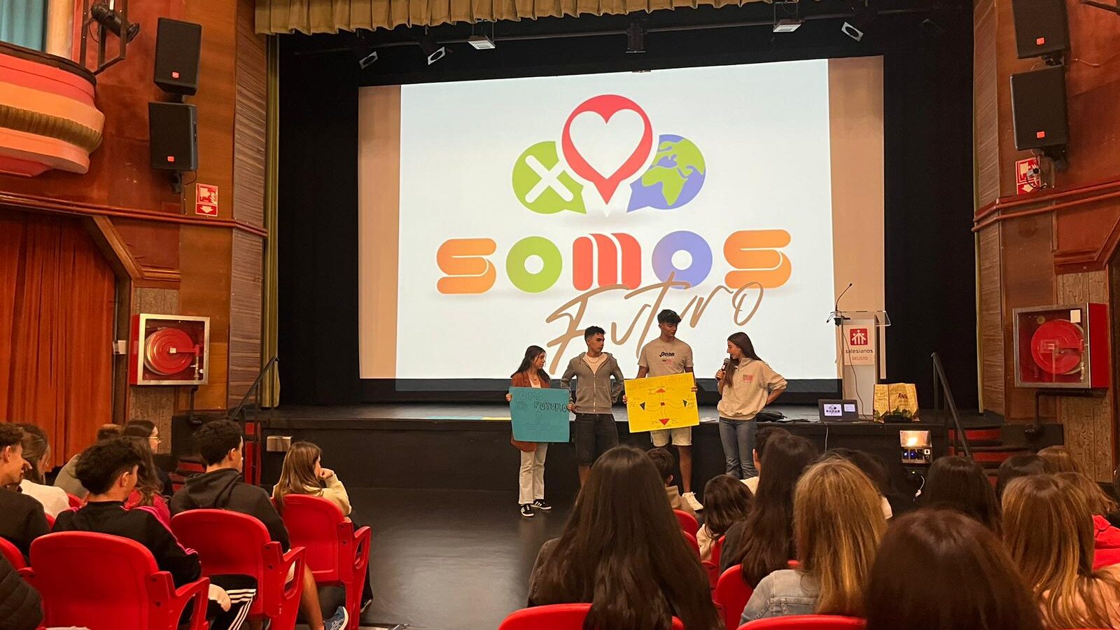 El 16 de septiembre, lunes, tuvimos la jornada de convivencias con l@s alumn@s de 1º Bachillerato. Tras los buenos días, nos dirigimos al teatro donde nos presentaron los objetivos del día, diversos proyectos de pastoral (acompañamiento, voluntariado, otoitzaldia) y varios vídeos en los que reflexionamos sobre temas relacionados con la campaña pastoral de este curso: «Somos futuro».