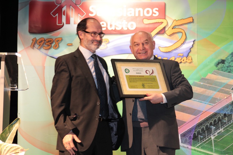 El pasado 4 de mayo, D. Isaac Diez, director de Salesianos Deusto, recibió el Diploma de manos D. Ángel Astorgano, Secretario General de la OIEC y presidente de Don Bosco Internacional, concediendo la “Mención de Honor” de la Oficina Internacional de la Educación Católica. La decisión, tomada el pasado 26 de abril reconoce a Salesianos Deusto, en el año de la celebración de su 75 aniversario: “en razón de su inestimable aportación a la educación humana, cristiana y profesional de los jóvenes y trabajadores de Bilbao y el País Vasco”.
