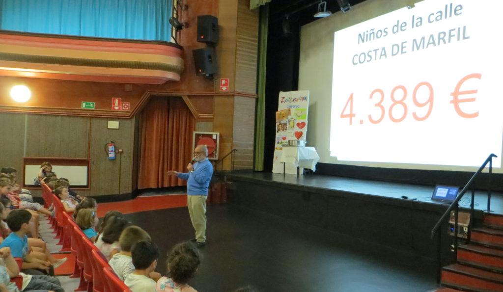 Como sabéis, el proyecto con el que estamos colaborando es el de Niños de la calle de Abidjan (Costa de Marfil). Gran parte del dinero recogido (4.389 €) se entregó el pasado 21 de junio a José Luis de la Fuente, salesiano coordinador de ese proyecto, que nos visitó dando los Buenos Días a todo el alumnado de Primaria. Además, se ha hecho el ingreso de 1.973,03 € a los Centros Juveniles Salesianos de Siria y otros 1.120 € al Proyecto de Niños y niñas de la calle de Freetown (Sierra Leona).