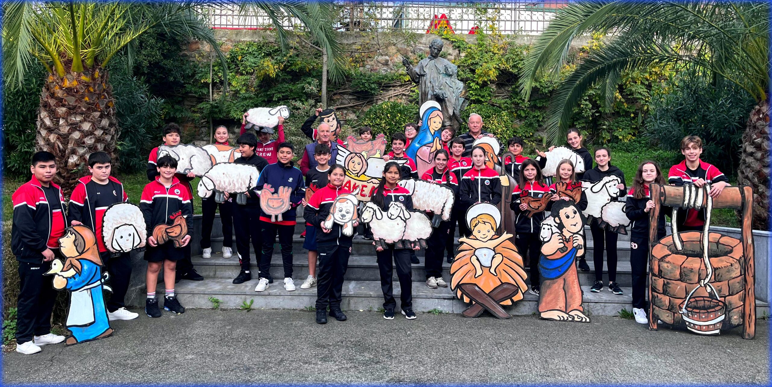 Alumnos de 1ºC de la ESO han colaborado en la colocación del Belén en los jardines del colegio.