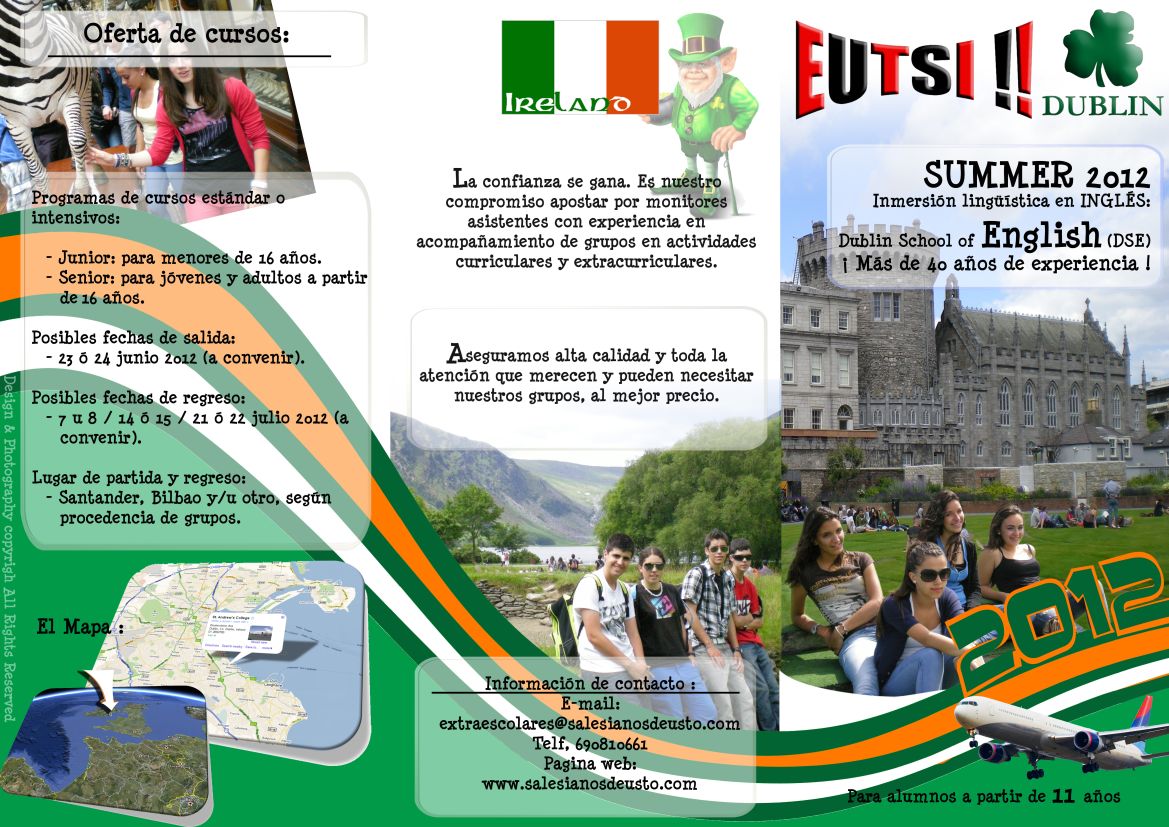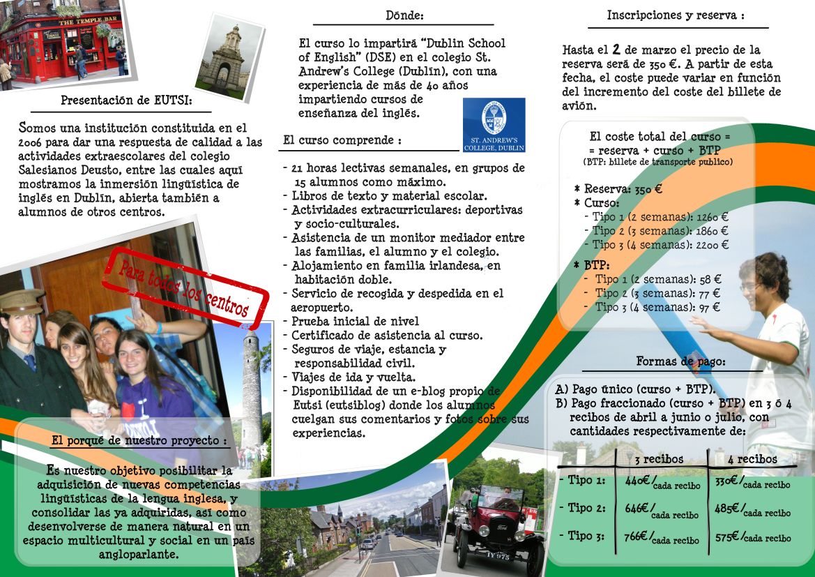 Eutsi, entidad organizadora de las actividades extraescolares en Salesianos Deusto, organiza todos los años una estancia en Irlanda con el próposito de dominar mejor el inglés. Este programa conlleva la asistencia al «Dublin School of English» del colegio»St. Andrew’s College» de Dublin. Desde una semana hasta un mes y puede ser para alumnos hasta 16 años y también para mayores de 16 y los interesados pueden consultarlo en los dos documentos que hay a continuación.
