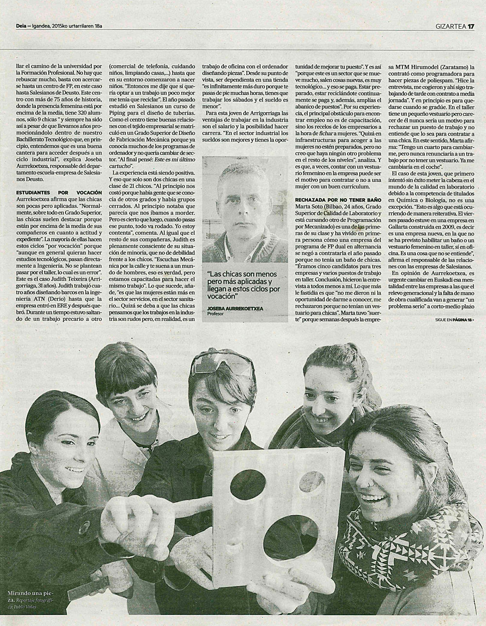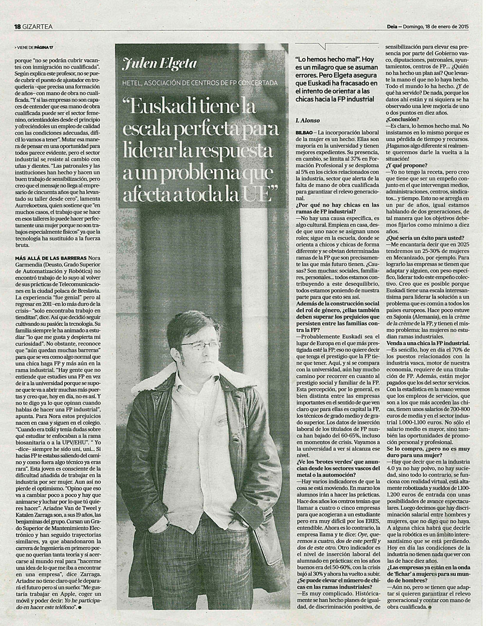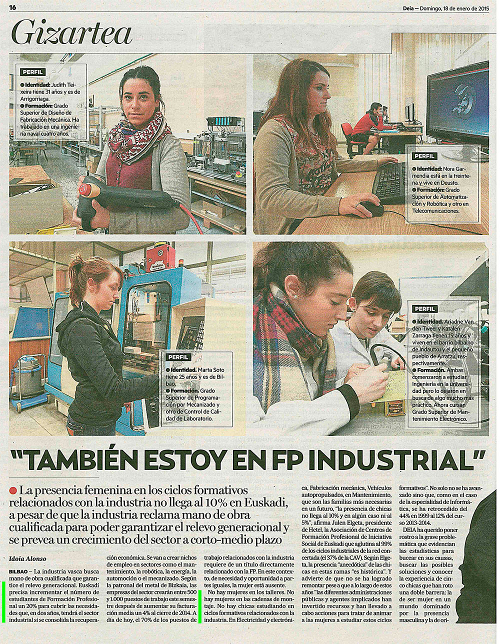 Es un tema que se repite de cuando en cuando. Si hace unos días entrevistaban a nuestras alumnas de Formación Profesional en RTVE-TELENORTE, este pasado domingo han sido el periódico DEIA quien se ha interesado por este tema y en tres páginas del diario dominical se ha explayado ampliamente para animar a que la mujer encuentre también su posibilidad laboral en el sector industrial de la FP; sólo hace falta escuchar los argumentos de las alumnas para verlo como un realidad factible. Termina la entrevista el presidente de HETEL que insiste en la misma línea. En imágenes, las tres páginas del periódico.