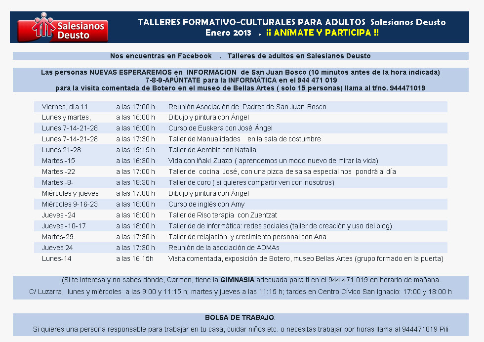 Nos llega la propuesta de los talleres para adultos que se han porogramado para el mes de enero.