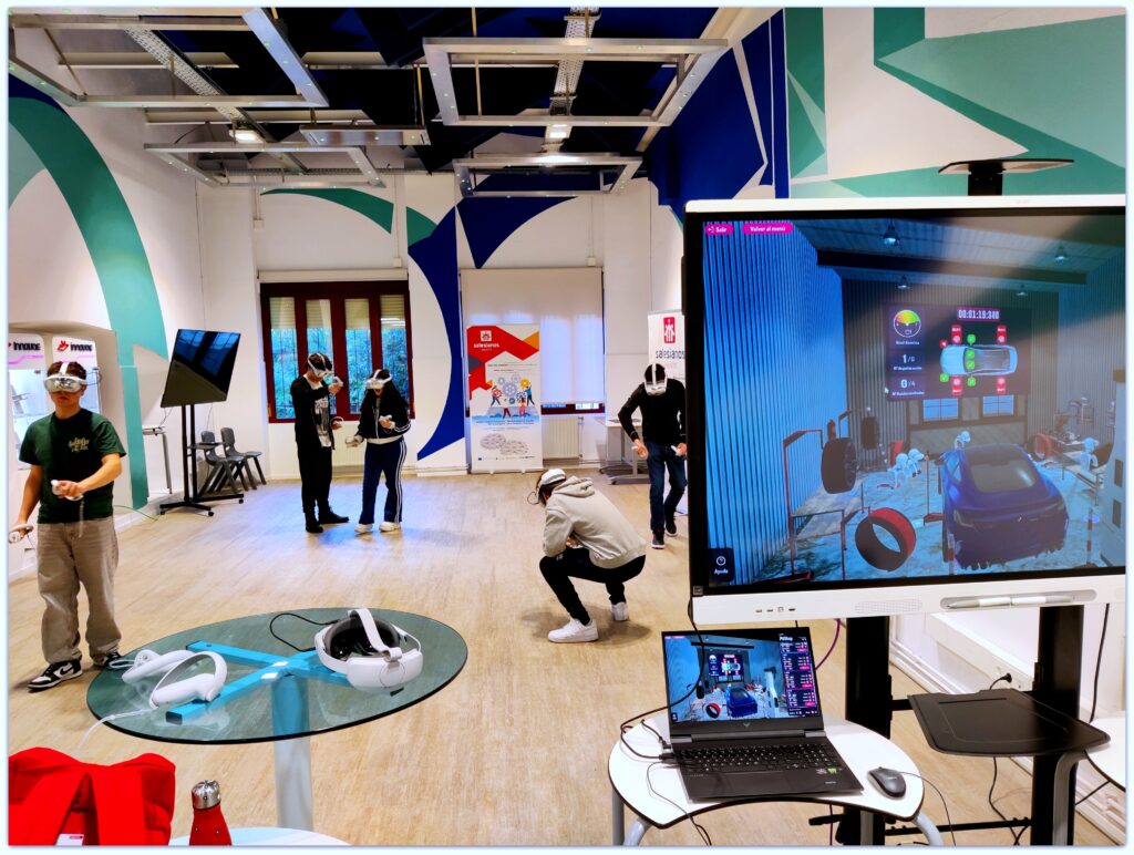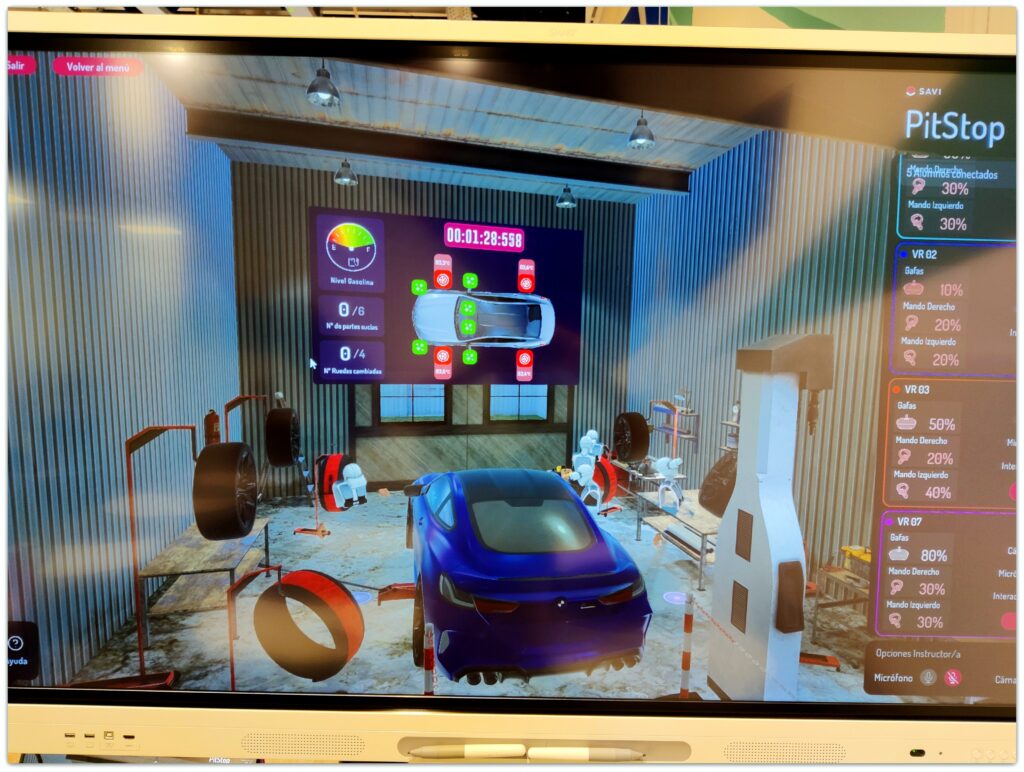 En esta primera práctica nos hemos centrado en la importancia del trabajo en equipo. Para ello mediante las gafas VR han podido trabajar colaborativamente en la puesta a punto de un coche. Juntos han tenido que usar el menor tiempo posible para limpiar, echar gasolina, cambiar las ruedas, etc. del coche.