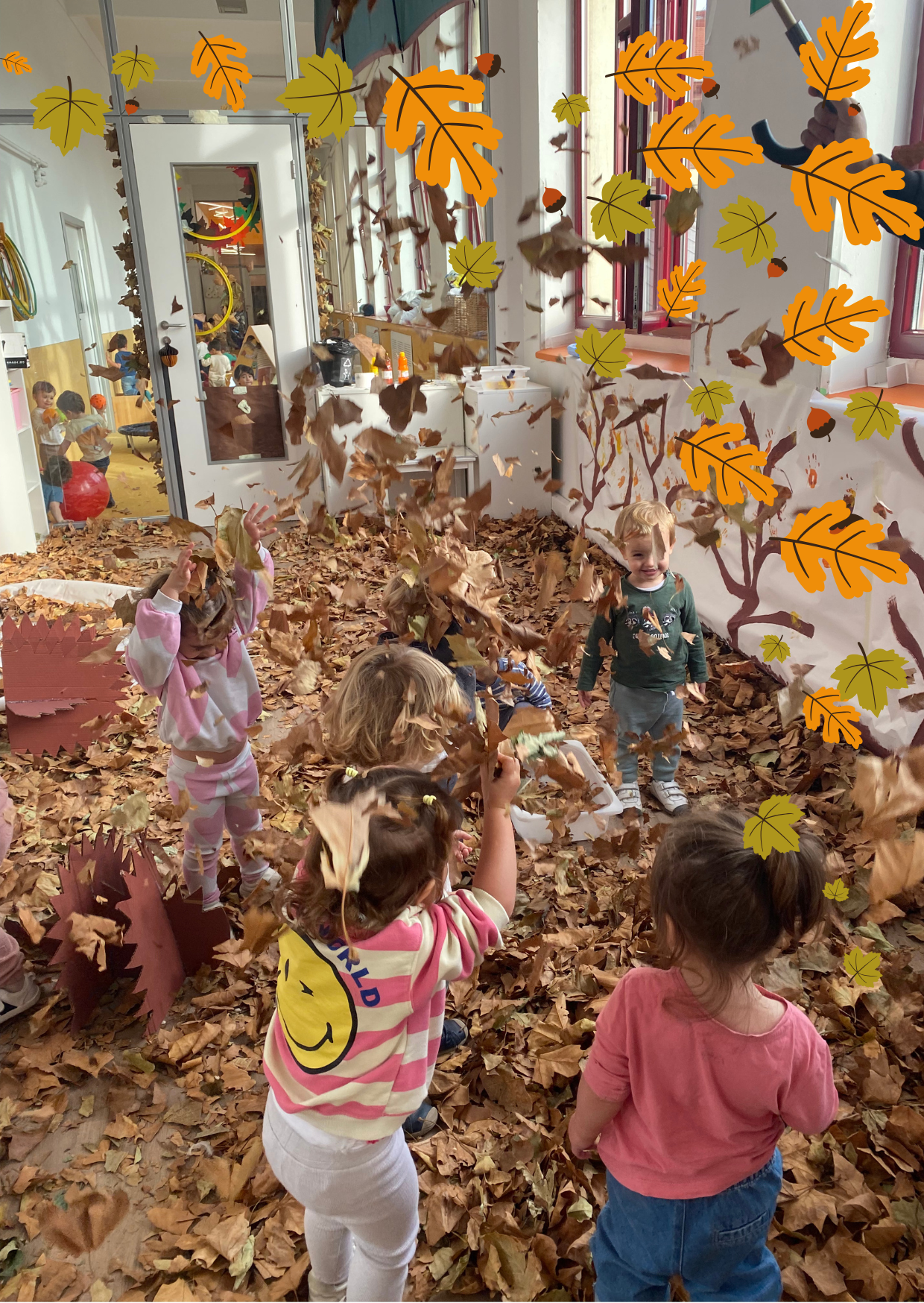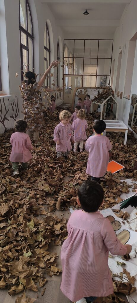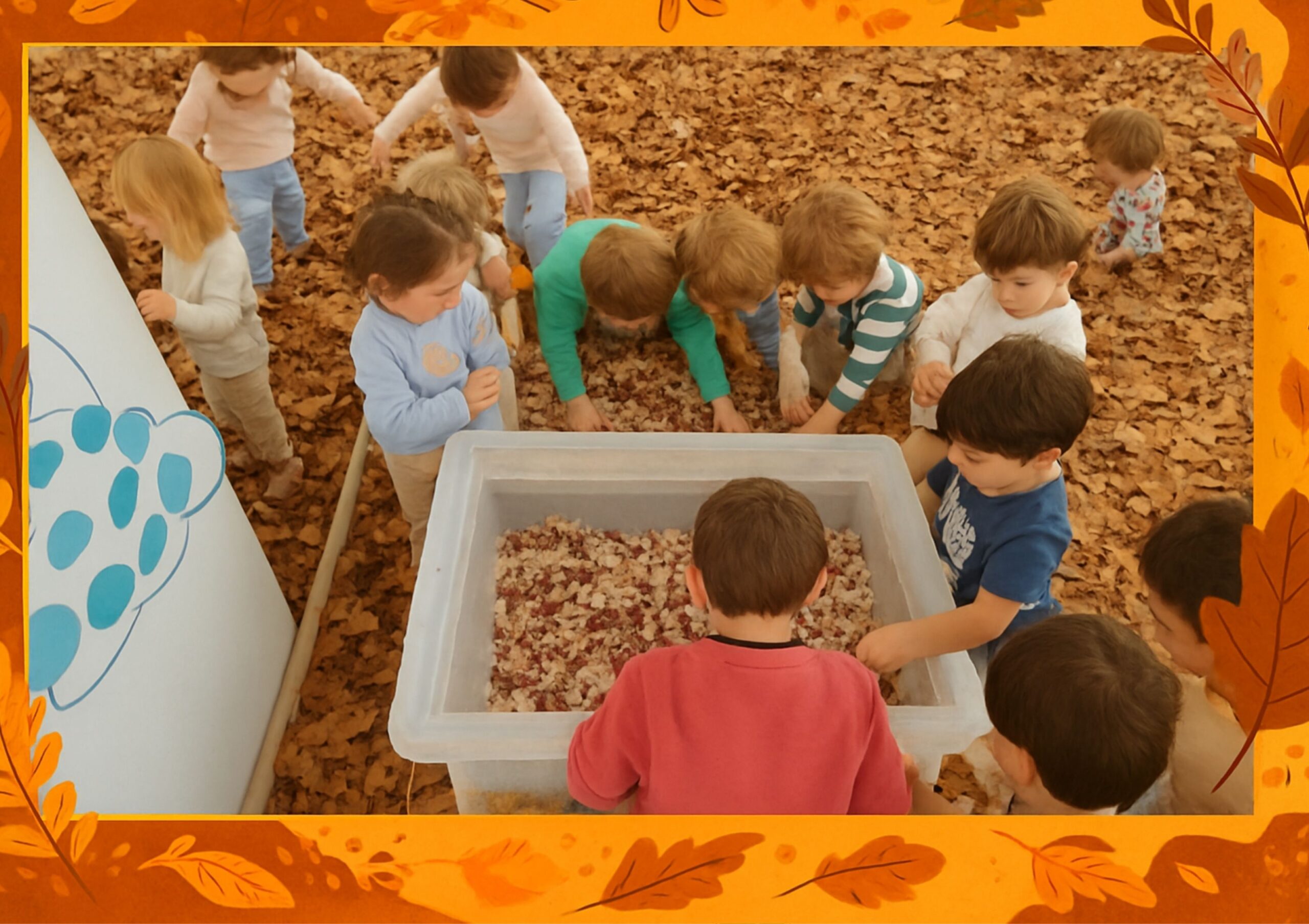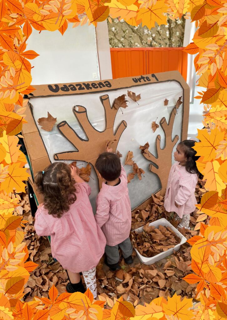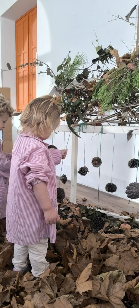 En este espacio, los niños tuvieron la oportunidad de manipular diferentes elementos propios de la estación, como hojas secas, frutas de otoño y materiales con variadas texturas.