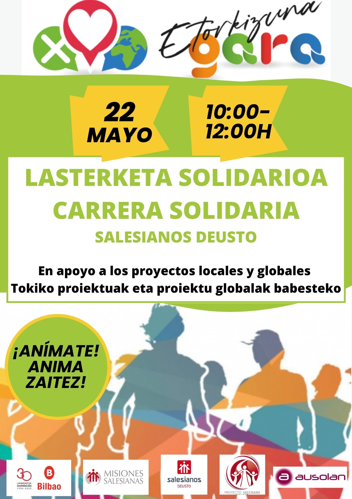 El próximo jueves 22 de mayo, celebraremos en Salesianos Deusto una nueva edición de nuestra Carrera Solidaria, promovida por la ONG Misiones Salesianas. Una iniciativa que, cada dos años, une deporte, solidaridad y educación en valores, y en la que participa toda la comunidad educativa. Contaremos además con la colaboración de la empresa del comedor Ausolan, que donará fruta a todos los participantes.