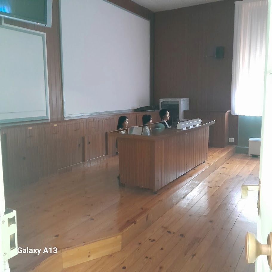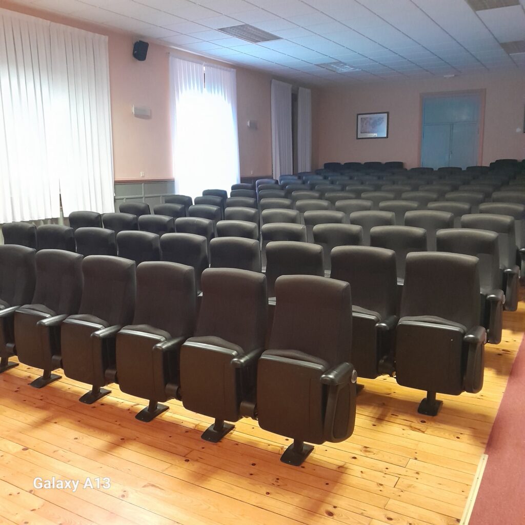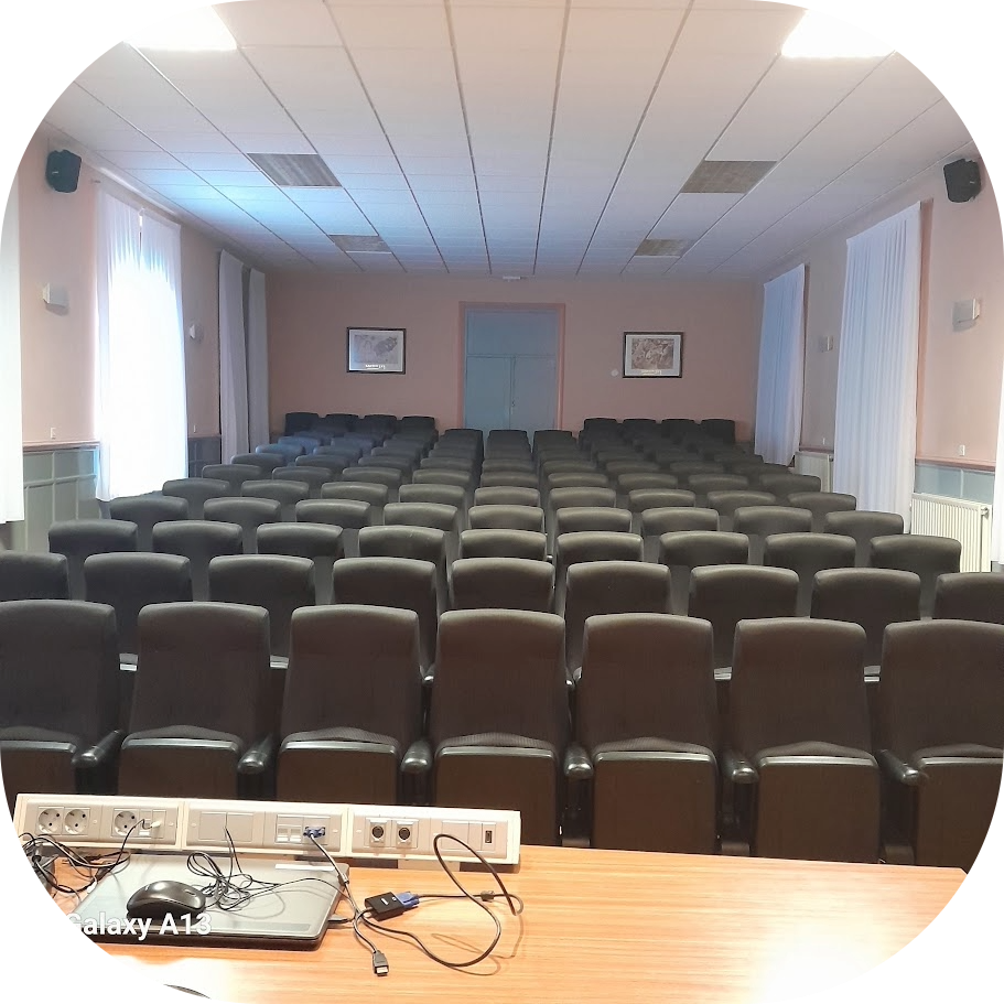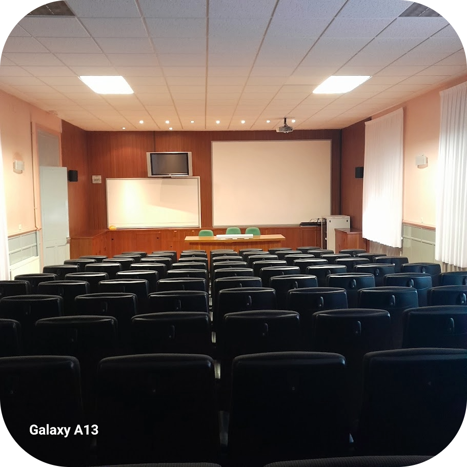 En la parte frontal se encuentra una pantalla de gran formato y un sistema de proyección de alta calidad. El sonido se distribuye mediante altavoces ubicados estratégicamente para asegurar que todas las personas puedan escuchar con claridad. La sala cuenta con micrófonos, sistema de iluminación regulable y conexión para distintos dispositivos multimedia.