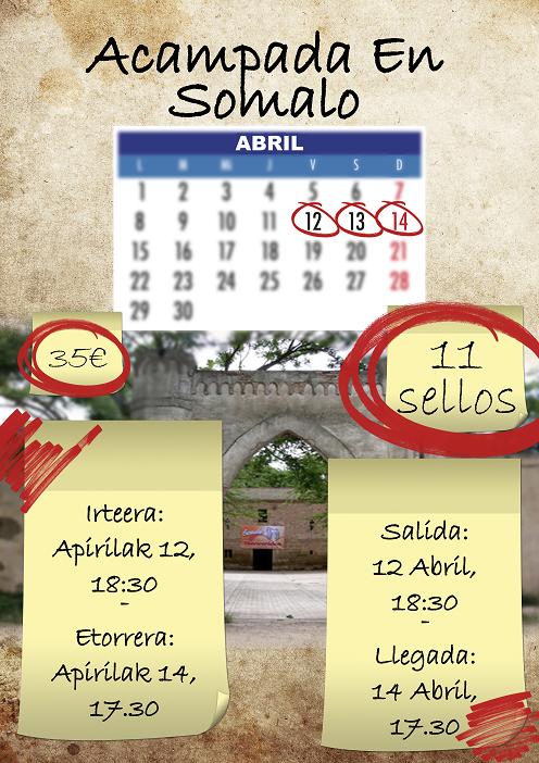Un año más “Nuestro Club” se pone la mochila al hombro e invita a todos sus socios a pasar un fin de semana de aventura. Y es que llega la Acampada. Del 12 al 14 de abril nos vamos a Somalo, en La Rioja, a compartir todos juntos tres días llenos de gymkhanas, campeonatos, veladas y talleres. Todo ello, claro está, con el estilo que nos caracteriza de amistad, compañerismo y alegría. Saldremos el viernes 12 de abril a las 18.30h del parking del colegio Salesianos Deusto y llegaremos el domingo 14 de abril a las 17.30h.Si quieres venir no tienes más que rellenar con tus padres la parte inferior de esta hoja y entregarla en la secretaría de “Nuestro Club” junto con los 35 euros que cuesta a actividad. Pero, ojo, tienes que tener 11 sellos (contando desde principio de curso) en tu carné para poder apuntarte. Recuerda que la inscripción la tiene que firmar tu padre, madre o tutor legal. ¡¡Date prisa que hay límite de plazas!! ¡¡No te lo pierdas!